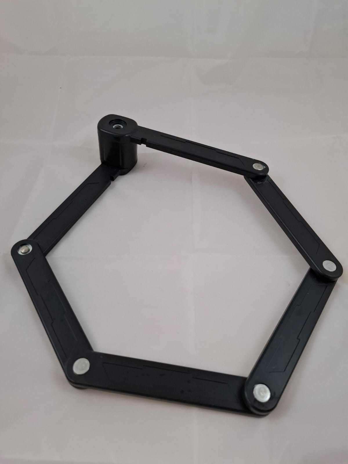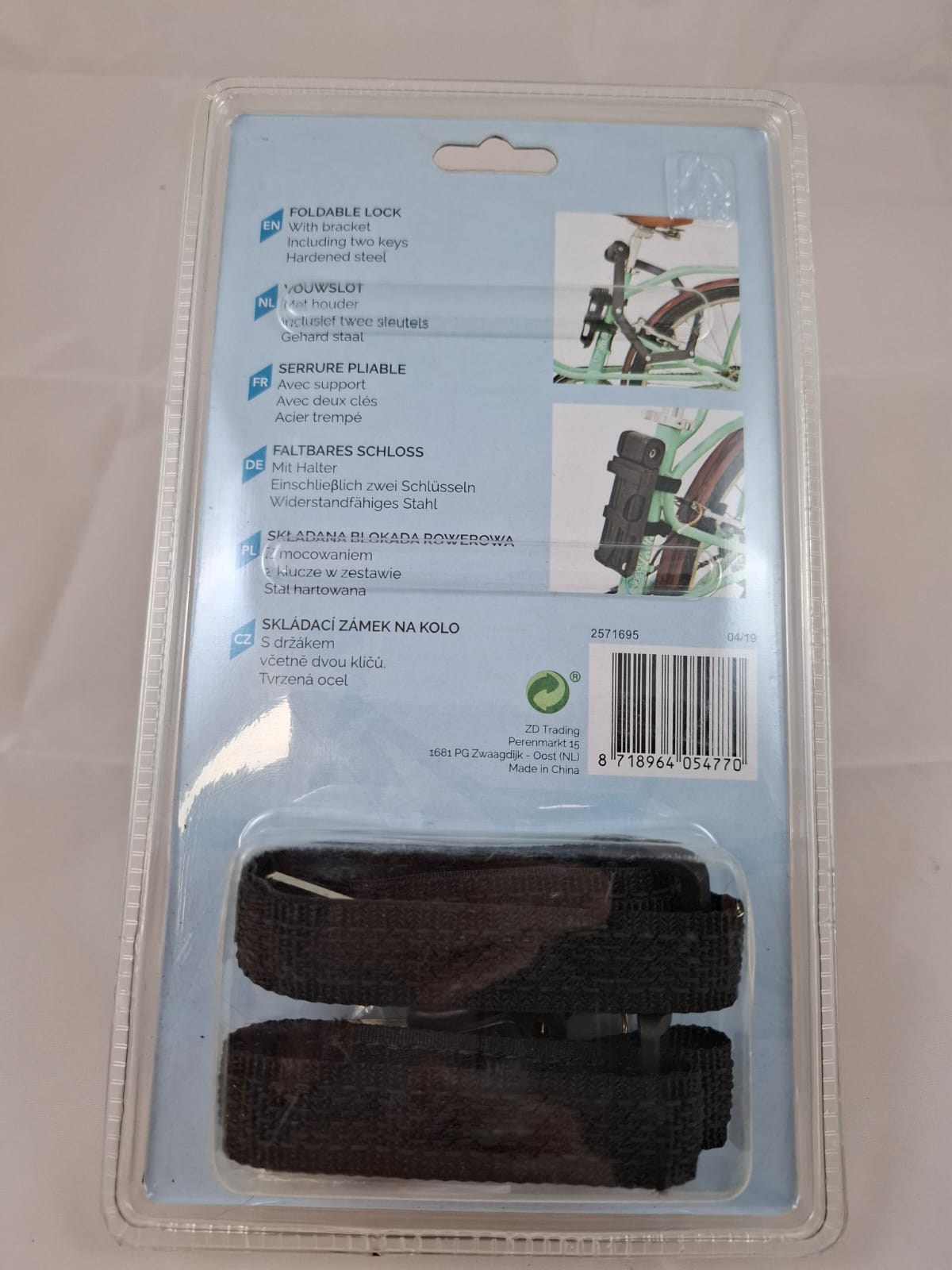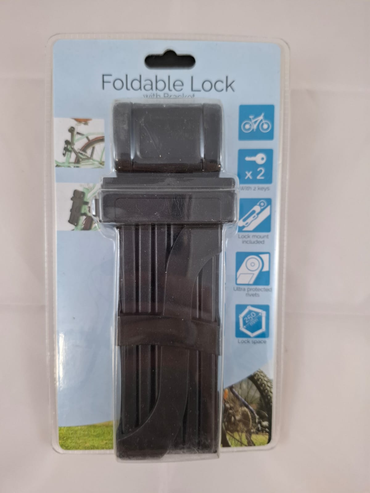 Vouwslot van gehard staal met 2 sleutels. Het slot wordt geleverd met een houder voor het te bevestigen op het frame